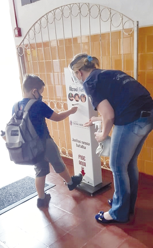 As crianças seguem todos os protocolos de higienização antes de entrar para a escola