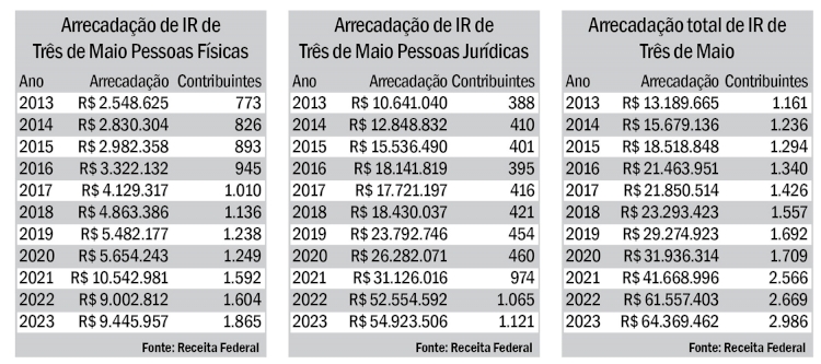 Em Três de Maio, a arrecadação do IR das pessoas jurídicas (PJs) teve um aumento ainda mais expressivo. Em 2013, o total arrecadado era de R$ 10,6 milhões, passando para R$ 54,9 milhões em 2023, o que corresponde a um aumento de 416% no período de dez anos. O número de contribuintes PJs quase triplicou, passando de 388 em 2013 para 1.121 no ano passado, um aumento de 188%. A média de arrecadação das PJs em 2023 foi de R$ 48.995.