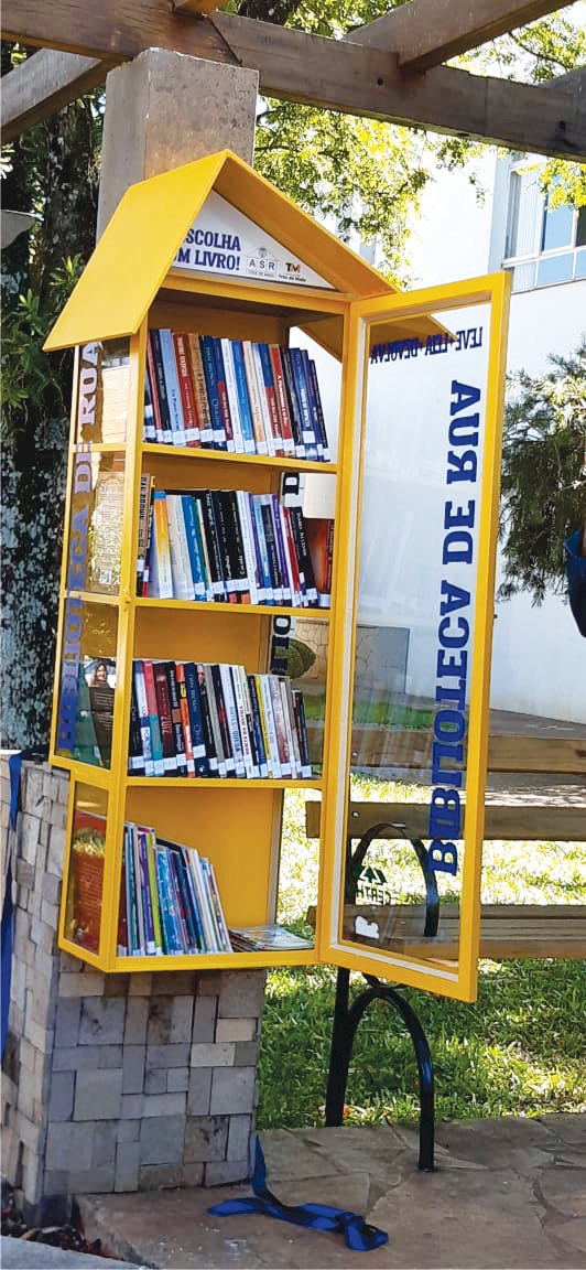 A primeira estante da Biblioteca de Rua está localizada no Pergolado, ao lado da Prefeitura, em diagonal ao Banco do Brasil. Quem quiser ler um livro – são muitos, dos mais diversos gêneros literários –, pode fazer a retirada, ler e depois devolvê-lo na estante. E, ainda, quem quiser contribuir com o projeto, pode levar o seu livro e fazer a sua doação nos pontos de coleta.