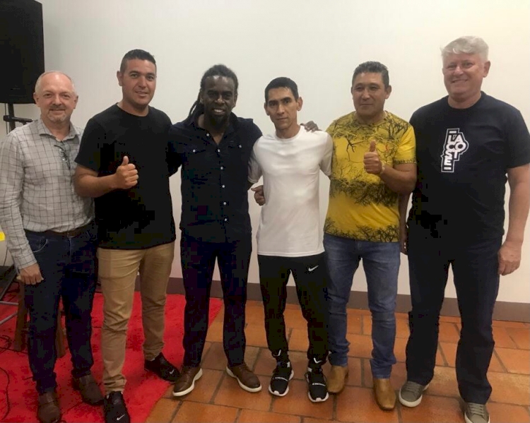 As Lojas Concreto oportunizou uma bela palestra com o ex-jogador de futebol Tinga. No registro, da esquerda para a direita, Ademir Inácio Riter, Robson de Bairros, Paulo César Tinga (palestrante), Cidinei F. de Bairros, Eri F. de Bairros e Astor Kolling. O evento foi na Bella Casa de Festas.