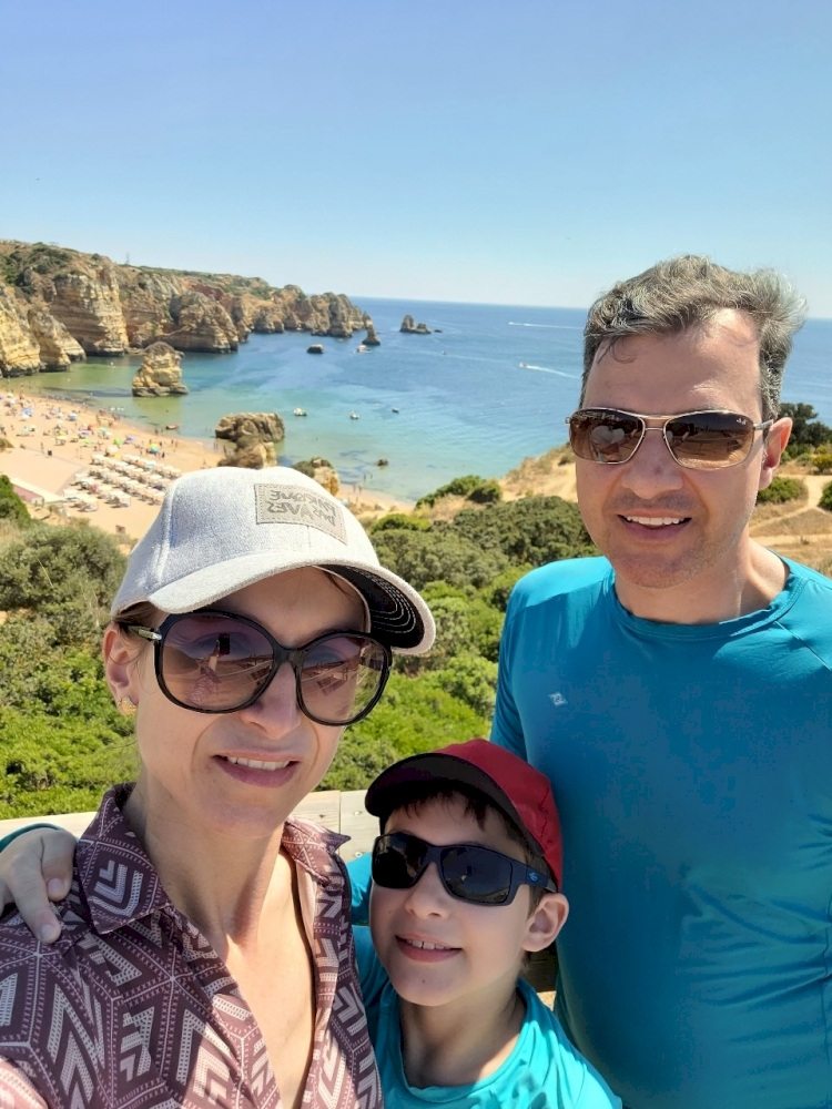 Márcio Lena, Mônica de Castilhos e o filho Lucas aproveitaram as férias escolares e fizeram um tuor por Portugal. Viagem linda, com muitos pontos turísticos. O registro é em Algarve, com a praia de Dona Ana ao fundo.