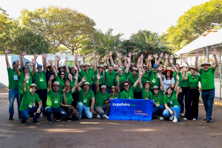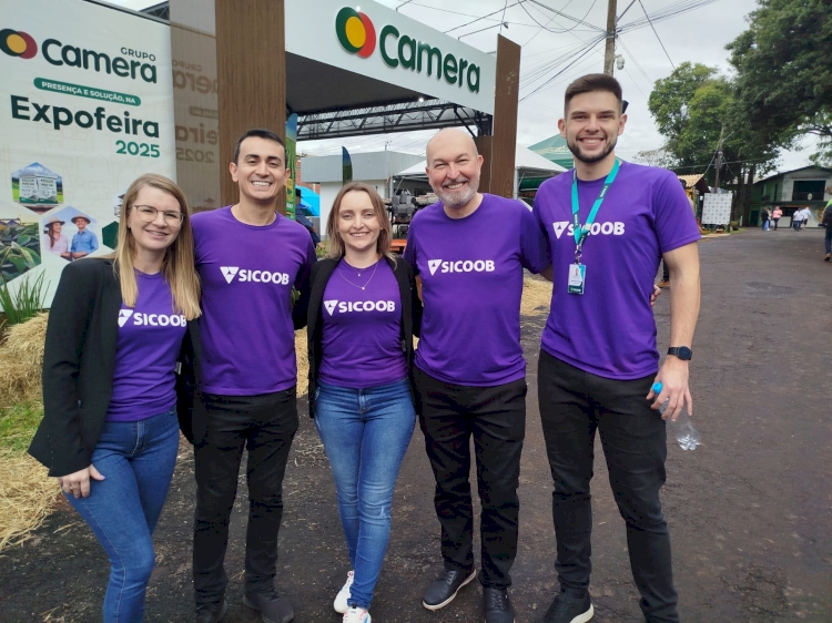 O estande do Sicoob na Expofeira 2025 contou com a presença do presidente do Sicoob Credial, Márcio Schmitt. No registro, ele está acompanhado de Jaqueline Kohls, gerente da agência de Boa Vista do Buricá; Ederson Abi, diretor de Marketing do Sicoob Credial de SC; Tassiara Azevedo, gerente da agência de Nova Candelária e Kelvin Schiavi, gerente da agência de Três de Maio