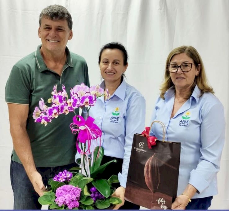 Parabéns para a diretora pedagógica da APAE, Simone Rossi Tiecher, pela idade nova, comemorada no último dia 8 de maio. No registro, ela está ladeada por Paulo Camargo, presidente da APAE, e Nadir Gabe, diretora administrativa