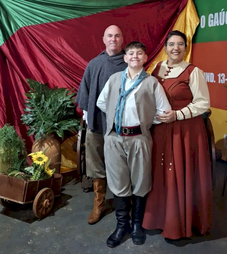 Jairo e Vânia, com o filho Artur Felten, no baile dos 67 anos do CTG Tropeiros do Buricá, no último sábado, dia 14. Artur faz parte do grupo de dança da Invernada Juvenil do CTG