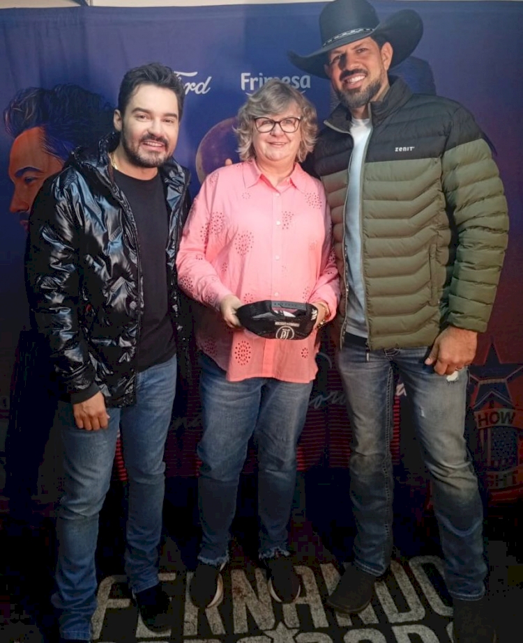 Um registro especial de Marília Metzka com a dupla Fernando e Sorocaba no show, do último domingo, dia 28, na Fenatrigo, em Cruz Alta. Não é de hoje que Marília é fã número um da dupla e, inclusive, já recebeu vários presentes, além de colecionar quase tudo que envolve seus ídolos. Ao participar de shows, Marília sempre é atendida no camarim com direito a foto.