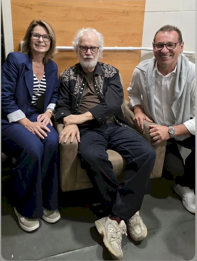 O casal Janice e Marcelino Colla, ladeando o grande poeta, cantor e compositor Renato Teixeira. O músico subiu no palco do Centro Cívico de Santa Rosa, no último sábado, dia 27, numa promoção do Sesc. Aos 80 anos, Renato encantou a todos com sua vitalidade, musicalidade, timbre e arte.