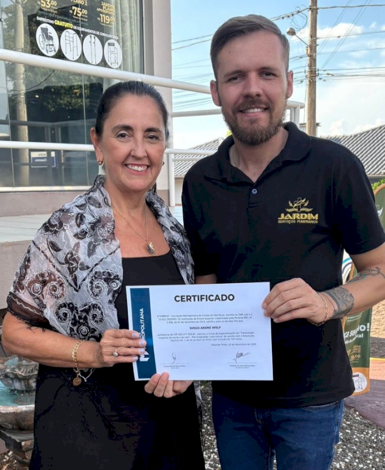 Diogo Wolf concluiu a pós-graduação em Tanatologia e Luto. Ele recebeu o certificado das mãos de Grazziela Tomasi, que também é graduada na área.