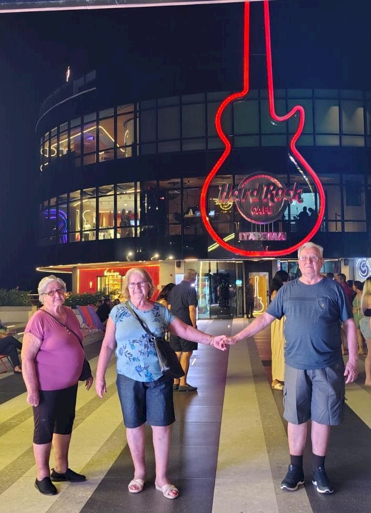 Maria Petter e o casal Teresinha e Luiz José Lena em frente ao Hard Rock Cafe, em Itapema (Santa Catarina). O cenário é o Píer Oporto, novo cartão-postal do Estado e um dos pontos turísticos mais belos da cidade, com quase 300 metros de extensão sobre o oceano, abrigando dezenas de lojas, restaurantes e espaços de lazer