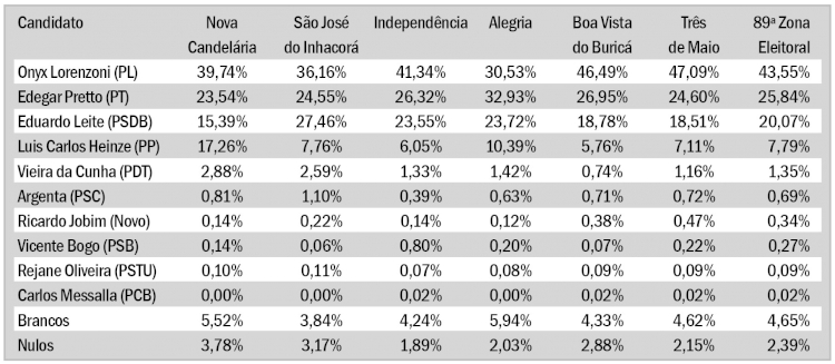 Mesmo disputando o segundo turno nas eleições, Eduardo Leite teve votação percentual inferior ao que recebeu em todo o Estado em nossa Zona Eleitoral. O tucano somente ficou em segundo lugar em São José do Inhacorá, onde conseguiu 27,46%, e ficou em quarto lugar em Nova Candelária, com 15,39%. Os nova-candelarienses colocaram em terceiro lugar o senador Luis Carlos Heinze (PP), com 17,26% dos votos, município em que o candidato teve maior votação proporcional. Na região, Heinze teve 7,79%.