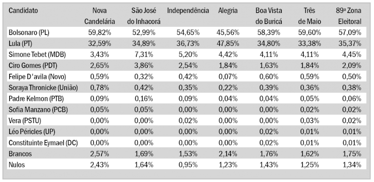 Foram 31.922 eleitores que compareceram às urnas no domingo. Para presidente da República, Jair Bolsonaro (PL) teve 57,09% dos votos, enquanto Lula da Silva (PT) ficou com 35,37%. O cenário foi próximo em todos os municípios, com exceção de Alegria, em que o candidato do PT teve 47,85%, contra 45,56% do candidato a reeleição. O município com maior diferença de votação foi em Nova Candelária, em que Bolsonaro atingiu 59,82% contra 32,59% de Lula. Em Três de Maio, o resultado colocou Bolsonaro com 59,60% e Lula com 33,38%.