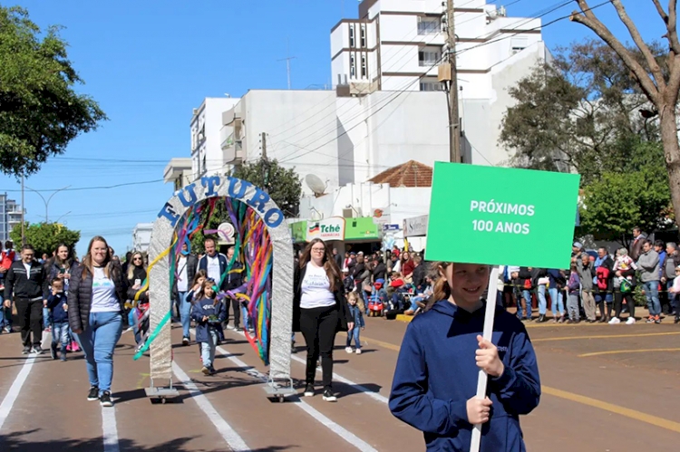 O Desfile Cívico da Semana da Pátria de 2022 teve como tema “Memórias Centenárias na Educação Três-Maiense”. A solenidade contou com o hasteamento das bandeiras, pronunciamentos das autoridades e homenagem aos 100 anos da Sociedade Educacional Três de Maio – Setrem e as senhoras centenárias do município: América Marchet dos Santos, Erna Streck Hollweg e Olga Keller Beckert.