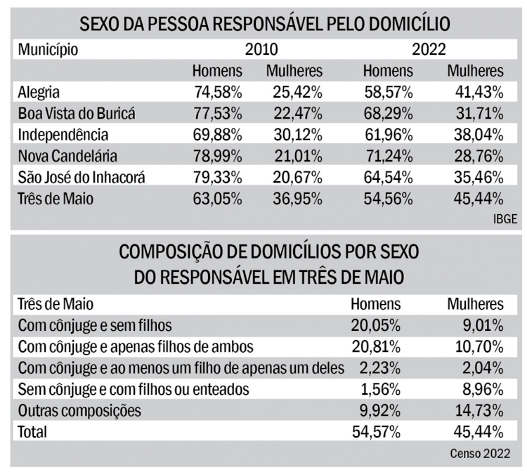 O mesmo movimento é percebido nos demais municípios da microrregião, com aumento na proporção de lares liderados por mulheres. Em São José do Inhacorá, por exemplo, o percentual passou de 20,67% em 2010 para 35,46% em 2022. Em Alegria, houve crescimento de 25,42% para 41,23%.