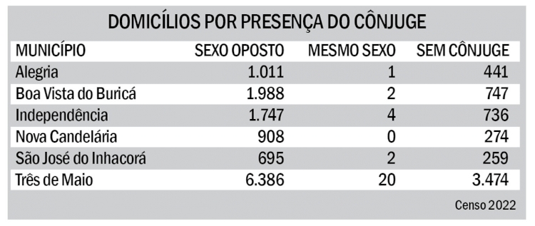 Entre os municípios da microrregião, o percentual de domicílios com cônjuges de sexo oposto é superior ao de Três de Maio. Em Boa Vista do Buricá, por exemplo, a proporção chega a 72,63% dos lares, enquanto Nova Candelária apresenta a maior proporção, com 76,82%.