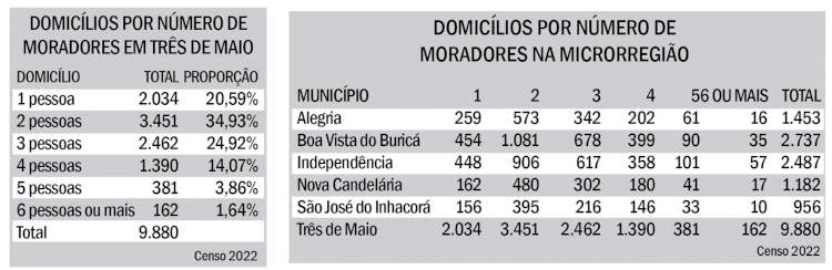 Atualmente, 20,59% dos lares três-maienses têm apenas um residente, enquanto que em 2010 essa proporção era de 13,79%. Isso significa que o IBGE, responsável pelo Censo, descobriu que um a cada cinco lares de Três de Maio é ocupado por apenas um morador.