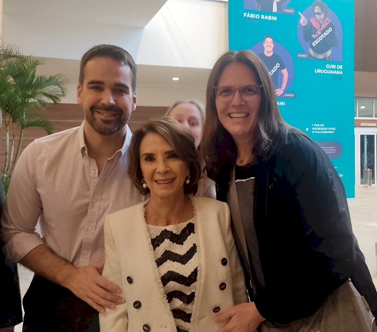 Governador Eduardo Leite, secretária estadual de Educação Raquel Teixeira e a diretora Rejane Petry, em agenda em Porto Alegre