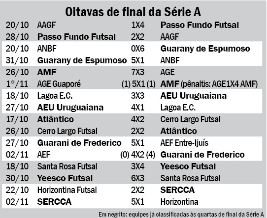Série A: O Horizontina Futsal perdeu por 1X5 para o SERCCA, em Casca, em 2 de novembro, e está eliminado da Liga A. Já o Santa Rosa Futsal, jogando dia 30 de outubro, também foi derrotado pelo Yeesco, por 6X3, e está também está fora da competição.