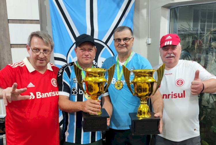 Anfitrião, Irineu Zart, e um dos organizadores, Mário Casarin, juntamente com os campeões Leandro e Ronaldo