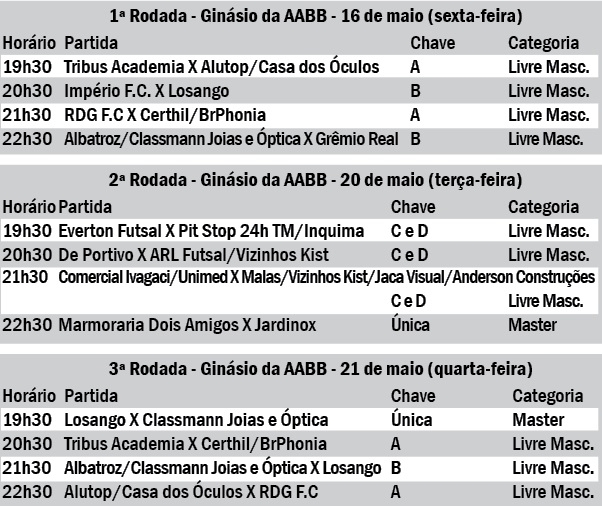O campeonato terá rodadas realizadas no Ginásio da AABB e Dom Hermeto. A primeira rodada inicia às 19h30, no Ginásio da AABB.