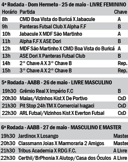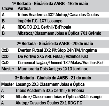 O Campeonato de Futsal 70 anos de Três de Maio segue movimentando as quadras três-maienses. No domingo, 25, acontecem as partidas da categoria Feminino. Na próxima semana, haverá jogos na segunda e terça-feira. Confira os resultados dos primeiros confrontos e os jogos das próximas rodadas.