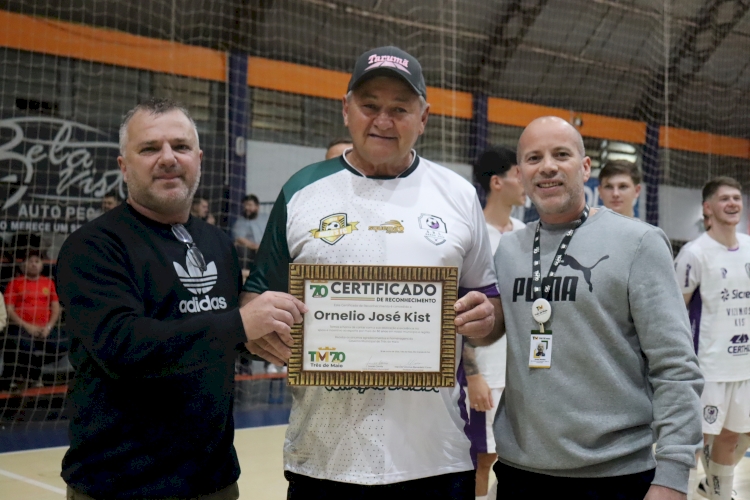 Ornelio Kist recebe homenagem durante as finais do Campeonato de Futsal 70 anos de Três de Maio