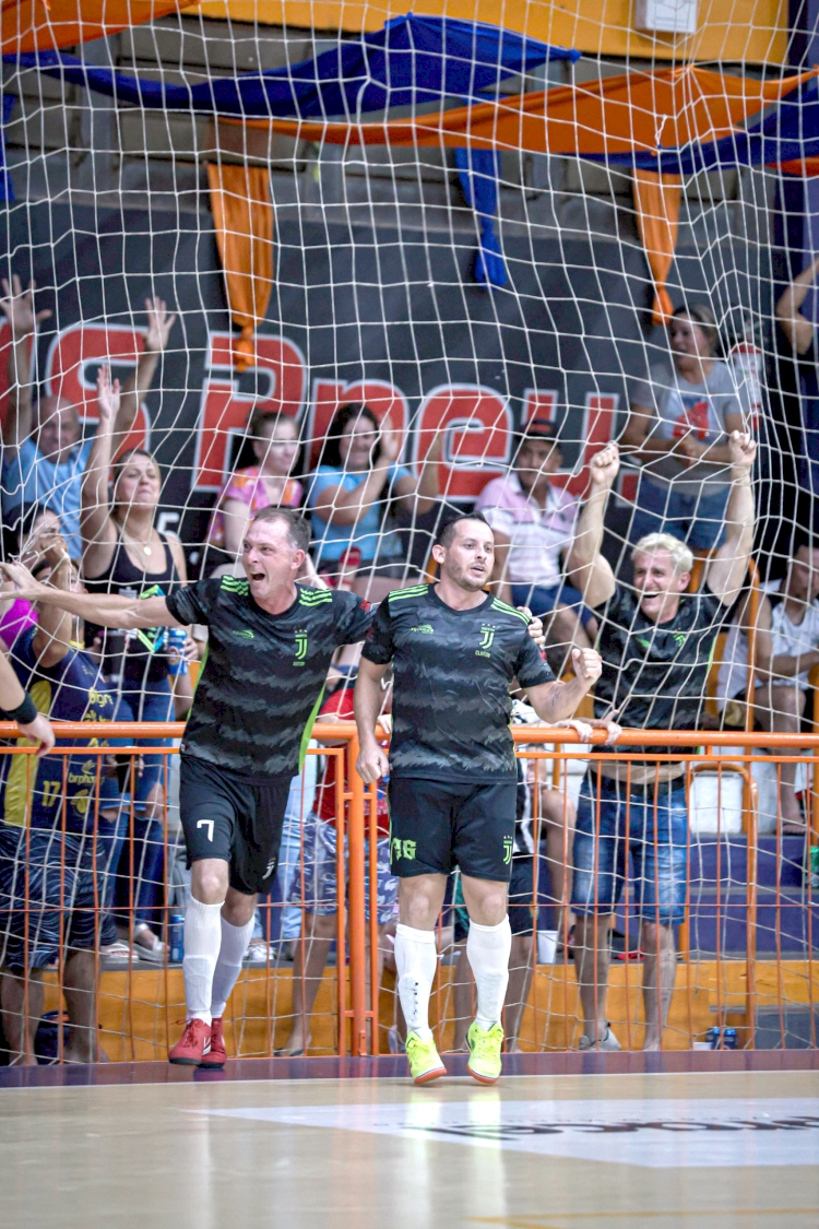 Na abertura da Categoria Veteranos, a torcida do Juventus apoiou a equipe em busca da vitória. Em quadra, atletas Airton Konig e Claiton Somavilla (autor de três gols na partida)