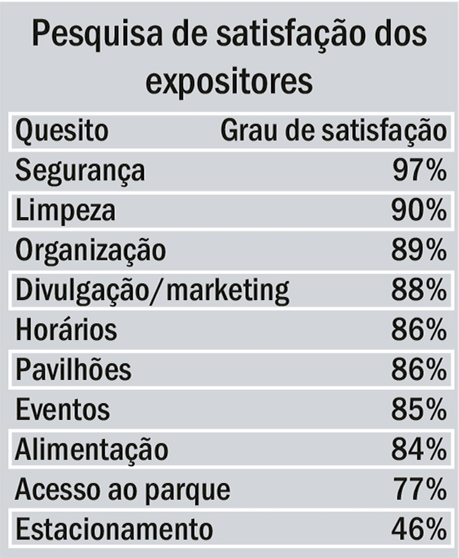 O acesso ao parque, com 77%, e estacionamento, 46%, registraram a menor satisfação. “Foram seis dias de chuvas e lógico que vai acabar gerando transtornos. Em um dos estacionamentos, pela Avenida Santa Rosa, oito dias antes de iniciarmos a Expofeira tinha uma lavoura de soja. E esses pontos temos que melhorar para que as próximas feiras tenham maior sucesso”, contextualiza o presidente José Henrique Weber.