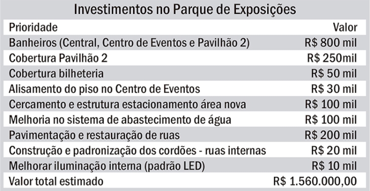 O presidente da Funcap também apresentou um levantamento quanto aos investimentos necessários para o Parque de Exposições Germano Dockhorn. Conforme a entidade, são necessários R$ 1,560 milhão em recursos para melhorar os espaços do parque e a acomodação dos expositores e visitantes.