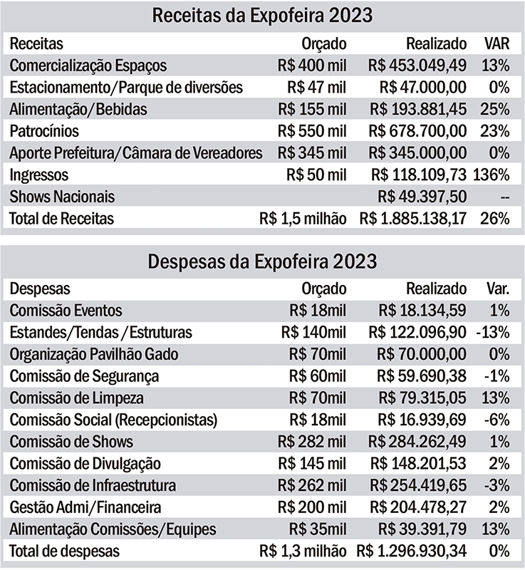 O total de receitas alcançou R$ 1.885.138,17. O número é 26% superior ao que foi orçado. As receitas incluem a comercialização de espaços e ingressos (R$ 861 mil), patrocínios (R$ 678 mil) e o aporte financeiro da Prefeitura (R$ 225 mil) e da Câmara de Vereadores (R$ 120 mil).