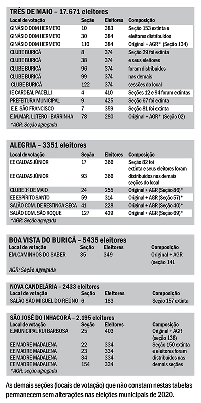Em Três de Maio, algumas seções foram agregadas e outras extintas, sendo os eleitores distribuídos em outras seções, mas no mesmo local
