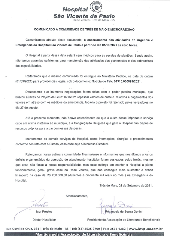 Em nota enviada ao Jornal Semanal na tarde de ontem, a direção do Hospital São Vicente de Paulo anuncia o fechamento do Urgência/Emergência a partir da zero hora do dia 1º de outubro. Conforme a nota, “a partir dessa data, o hospital estará sem médicos para as escalas de plantões”. “Sendo assim, não temos garantias suficientes para manutenção das atividades dos plantonistas e dos sobreavisos das especialidades”, diz o comunicado. Ainda, segundo a nota, o Ministério Público já foi comunicado, na quarta-feira, dia 1º, para as providências legais.