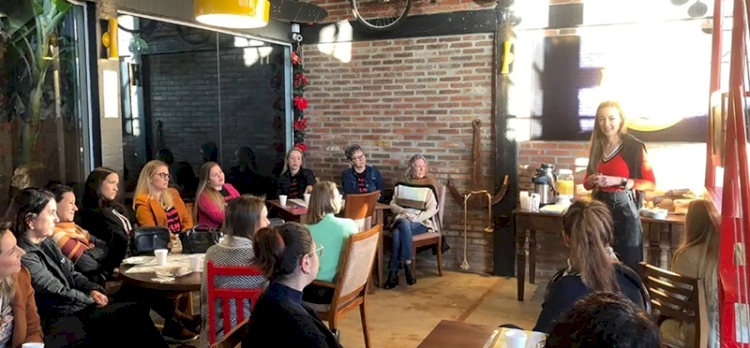 Café com empresárias do Núcleo das mulheres Empreendedoras 2023. Entre as diversas ações, foi a palestra (foto) com Carla Hermes que falou sobre Maternidade e seu Impacto Profissional