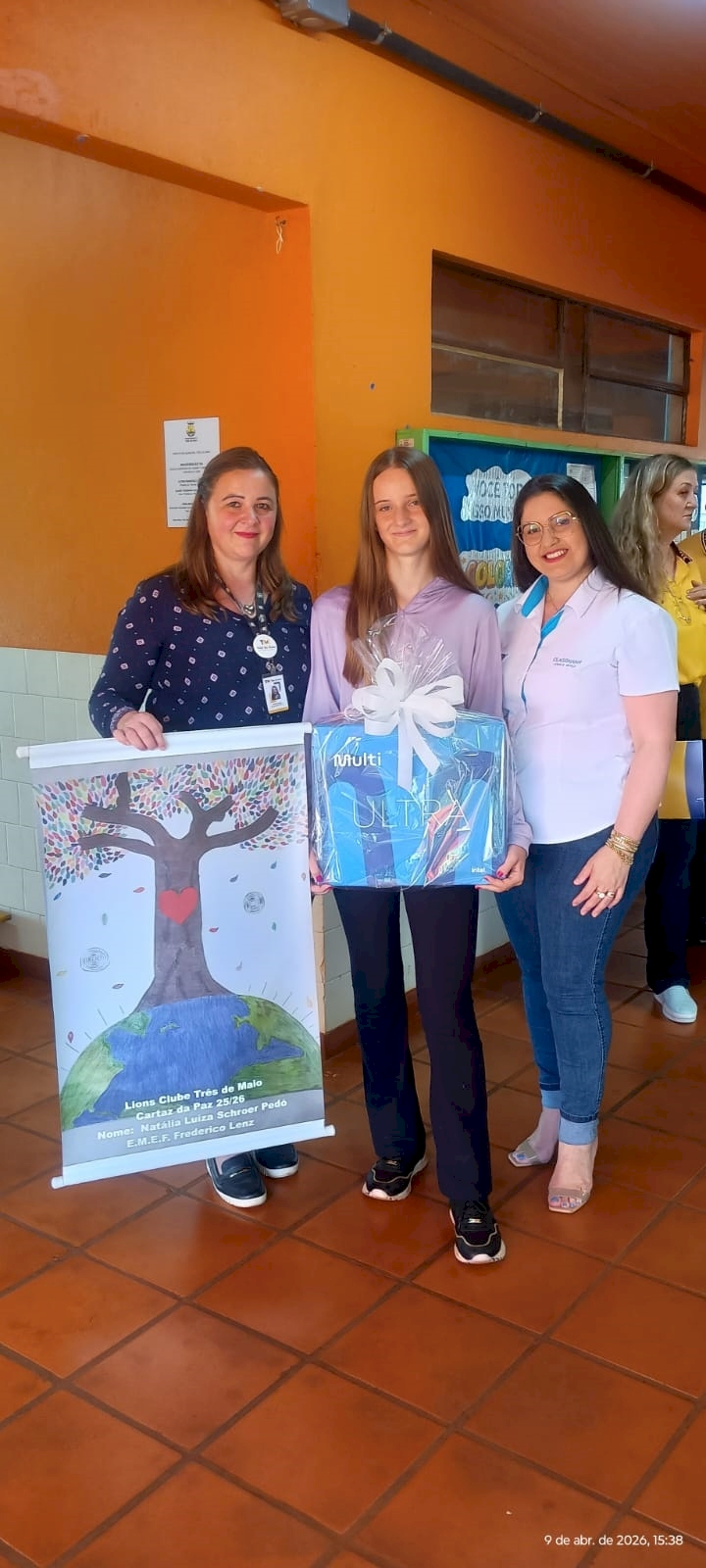 O Lions Clube Três de Maio realizou a entrega dos prêmios do Concurso Cartaz da Paz no dia 9 de abril, na EMEF Frederico Lenz. A iniciativa do clube de serviços visa incentivar estudantes das redes municipal e estadual a refletirem sobre a importância da paz no mundo.