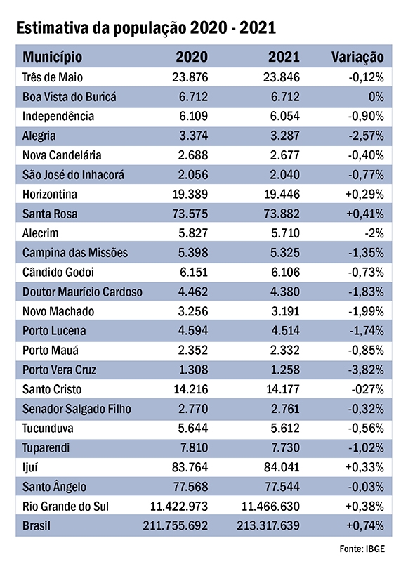 Na região da Amufron – Associação dos Municípios da Fronteira Noroeste –, que é composta por 20 municípios, Santa Rosa segue a cidade mais populosa, seguida por Três de Maio. Quanto ao aumento populacional, somente Santa Rosa e Horizontina apresentam crescimento, enquanto os demais municípios tiveram redução, com exceção de Boa Vista do Buricá, onde a estimativa se manteve a mesma do ano anterior.