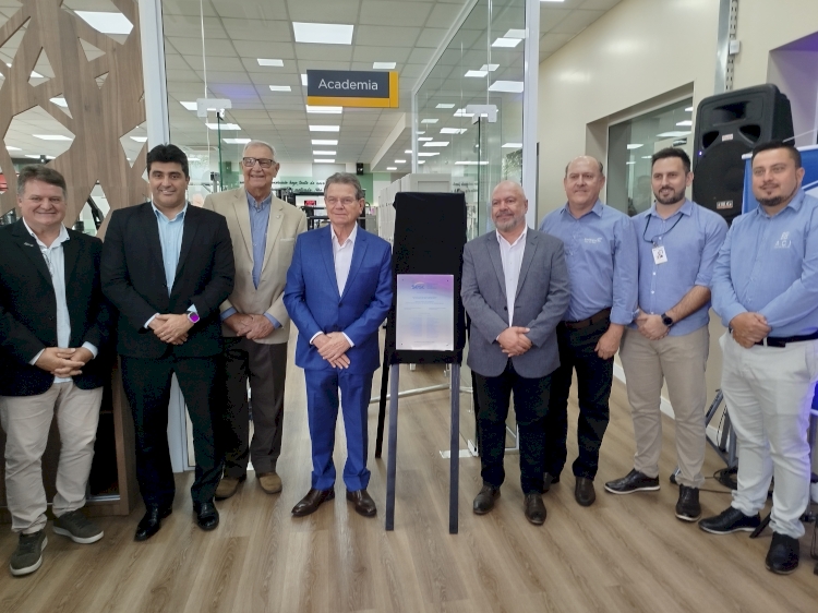 Antônio Granich (Cuca), presidente do Sindilojas Celeiro; Marcelo Campos Afonso, diretor do Sesc RS; Ernesto Kochhann, ex-presidente do Sindilojas; Luiz Carlos Bohn, presidente do Sistema Fecomércio RS Sesc/Senac; Edson Flores de Campos, diretor do Sesc Três de Maio; Dilson Mireski, presidente do Sindilojas; prefeito Marcos Corso e Jesildo Moura de Lima, presidente da ACI, no momento da inauguração do novo espaço da academia do SESC