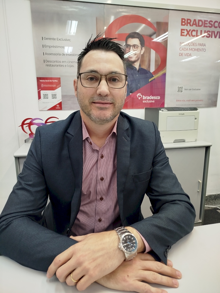 BRADESCO – A agência de Três de Maio está com novo gerente. Trata-se do três-maiense Rodrigo Schakofski, 40 anos, filho de Alice e Elvino (em memória). Casado com Claudiane, é pai de três filhos. Com 21 anos de banco, Rodrigo iniciou sua carreira em Três de Maio, aos 19 anos. Já passou por várias agências, entre elas, de Palmeira das Missões, Carazinho e Santa Maria.