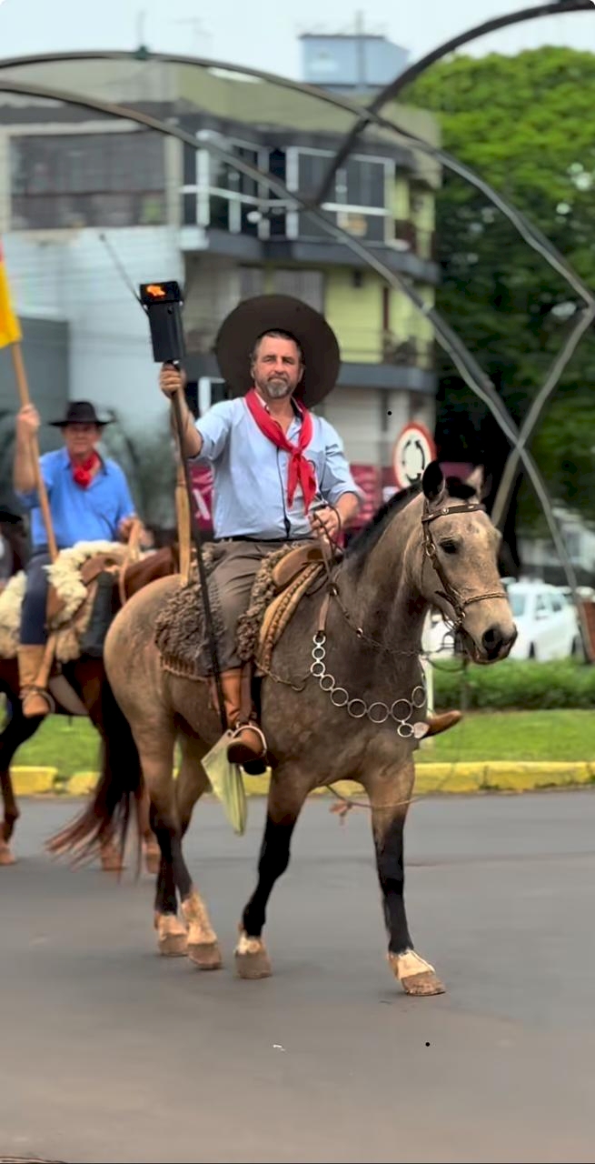 PARABÉNS FLÁVIO – Na cidade de Humaitá, onde foi distribuída a Chama Crioula para a 20ª RT, foi realizada homenagens a tradicionalistas que contribuíram com os CTGs da região. De Três de Maio, o Tropeiros do Buricá homenageou o ex-patrão Flávio Jorge Huber, em reconhecimento ao trabalho dedicado e à história construída em prol do movimento tradicionalista.