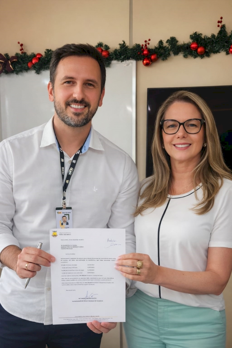 CÂMARA DE TRÊS DE MAIO – O Poder Legislativo abriu mão de parte do duodécimo ao qual tinha direito. Somente nessas antecipações, o total devolvido ao Poder Executivo Municipal somou R$ 230 mil. Com o encerramento do exercício financeiro, a Câmara realizou, ainda, a devolução final no valor de R$ 124.125,94. Dessa forma, o valor total devolvido em 2025 foi de R$ 354.125,94. A entrega dos valores foi feita pela secretária-geral da Câmara Jaci Taborda ao prefeito Marcos Corso (foto).