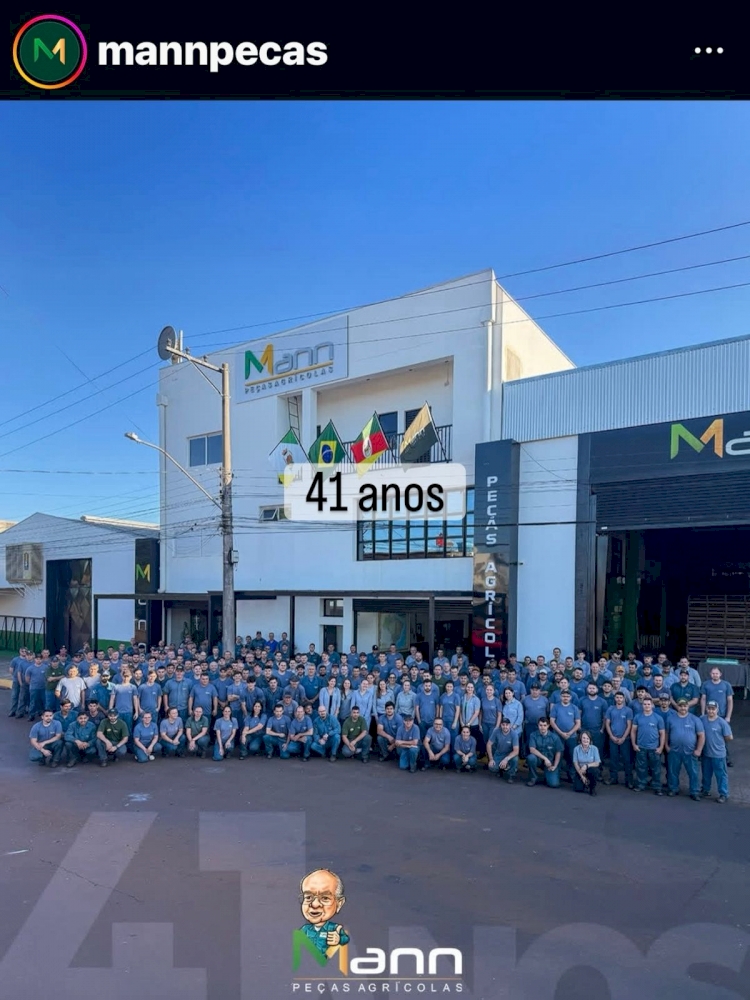 ROMAR MANN 41 ANOS – Uma história que iniciou com o casal Romar e Neli Mann. Em 1985, a empresa passou a ser Romar Felipe Mann e Cia Ltda, com os sócios: Romar Mann (em memória), Ricardo Mann, Marta Mann Baiotto e Eron Teixeira. Hoje conta com mais de 240 funcionários, sendo a indústria que mais lança ítens novos nas linhas da John Deere, New Holland e Case. Parabéns a direção e seus colaboradores.