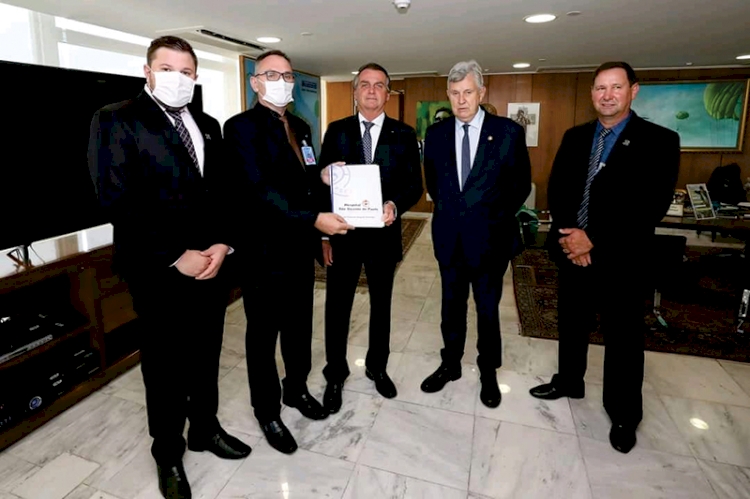 CARLOS FILIPIN EM BRASÍLIA – Como delegado regional do CRA/RS, o administrador Carlos Norberto Filipin entregou documento em mãos ao presidente Jair Bolsonaro, solicitando um Tomógrafo para o Hospital São Vicente de Paulo. O pedido conta com o apoio do diretor-executivo, Igor Prestes; da gestora Irmã Oltenira Carneiro e do médico Ronaldo Mendes, da Unimed Alto Uruguai. O aparelho irá atender os munícipes de Três de Maio, Alegria, Independência, São José do Inhacorá, Boa Vista do Buricá, Nova Candelária, entre outros. Esteve presente no ato da entrega o senador Luiz Carlos Heinze, e os vereadores de Alegria, Norton Augusto Martini Filipin e Elcio José Bueno.
