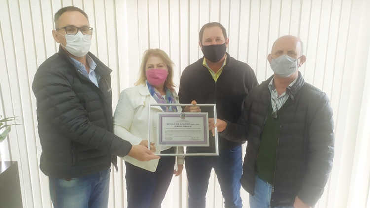 SEMANAL 33 ANOS – HOMENAGEM – Na segunda-feira recebemos em nossa redação a visita do presidente da Câmara de Vereadores de Alegria, Élcio Bueno, acompanhado de Carlos Norberto Filipin, presidente do Conselho Regional de Administração e Marco Jost, artesão. Na ocasião, o Semanal recebeu uma placa de Moção de Aplauso pela passagem dos 33 anos de história, comemorados no dia 16 de junho. Já a colunista Yara Lampert recebeu uma homenagem pelos 19 anos de colunista deste semanário. Nosso agradecimento, em meu nome e da minha esposa Amara a todos os vereadores do vizinho município pela homenagem.