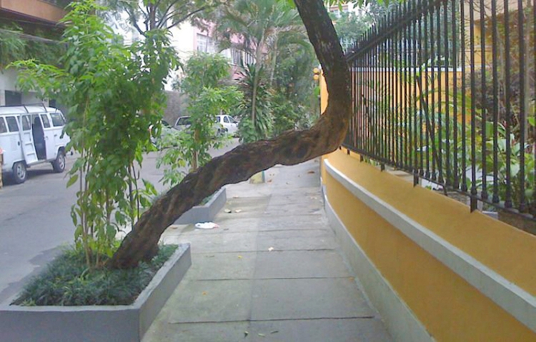 A foto exemplifica a interferência da vegetação na faixa livre de pedestres, oferecendo risco à segurança. Um deficiente visual, por exemplo, não detectará esta árvore, já que a mesma se tornou um obstáculo suspenso