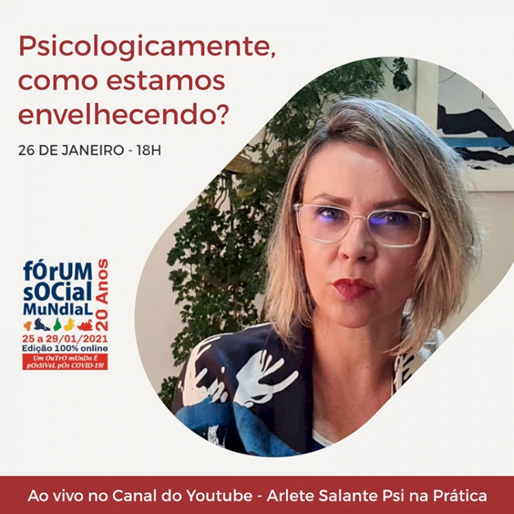 O Fórum será constituído de uma programação principal (transmissão via ALRS), com palestrantes internacionais e nacionais, e de uma programação paralela, cuja transmissão será feita pelas redes sociais de cada palestrante. Dessa forma, no próximo dia 26 de janeiro, terça-feira, a psicóloga Arlete Salante fará uma palestra-aula ao vivo, às 18h, sobre o tema “Psicologicamente, como estamos envelhecendo?”, diretamente do seu Canal do Youtube: Arlete Salante Psi Na Prática. Para assistir ao vivo a palestra basta acessar este link: https://www.youtube.com/watch?v=wpK2aWbvsi0