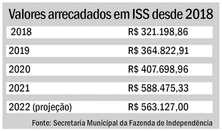 O Município de Independência prevê arrecadar R$ 563.127,00 sobre o Imposto sobre Serviços de Qualquer Natureza-ISS para o ano de 2022. As informações são da Secretaria Municipal da Fazenda. Apesar da pasta projetar uma receita inferior ao ano de 2021 (R$ 588 mil), o valor previsto para 2022 registra um aumento de 75% em comparação a 2018, quando o município arrecadou R$ 321.198,86.