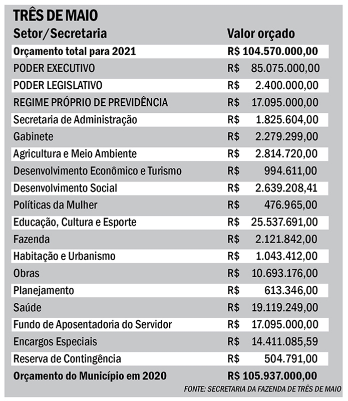 Em Três de Maio, Orçamento é R$ 1,367 milhão menor com relação a 2020. Maior montante será destinado para a Secretaria de Educação, superior a R$ 25 milhões. Já São José do Inhacorá teve um incremento de mais de R$ 1 milhão para 2021
