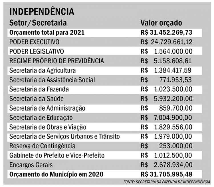 O Jornal Semanal realizou levantamento com as prefeituras da microrregião sobre o Orçamento previsto para 2021 e quais setores e secretarias devem receber maior volume de recursos para investimentos. Os municípios de Independência e Três de Maio tiveram decréscimo nos Orçamentos de 2021, em relação ao ano passado. Independência passou de R$ 31.705 milhões para R$ 31.452 milhões, ou seja, em torno de R$ 250 mil a menos que no ano passado. Já em Três de Maio, o Orçamento que era de R$ 105.937 milhões em 2020, passou para de R$ 104.570 milhões, em 2021, ou seja, R$ 1,367 milhão a menos.