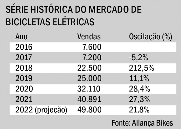 A Associação Brasileira do Setor de Bicicletas, Aliança Bike, publicou o boletim do mercado de bicicletas elétricas 2022, em fevereiro deste ano. Conforme o boletim, o setor de bicicletas elétricas não registrou a mesma oscilação de mercado entre 2020 e 2021. No período, enquanto a venda de bicicletas em 2020 apontou um aumento expressivo de 50% e um recuo de 2% em 2021, as bikes elétricas registraram o crescimento anual de 27% em 2020 e 21% no ano de 2021.