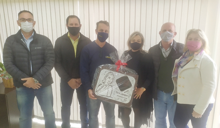 A colunista social do Semanal, Yara Lampert, também recebeu homenagem pelos 19 anos de sua Coluna, através de um lindo quadro produzido pelo artesão Marco Jost, do município de Alegria. A obra foi esculpida de forma manual em madeira de demolição, com trabalho de resina epóxi e acabamento com óleo mineral e cera de abelha.