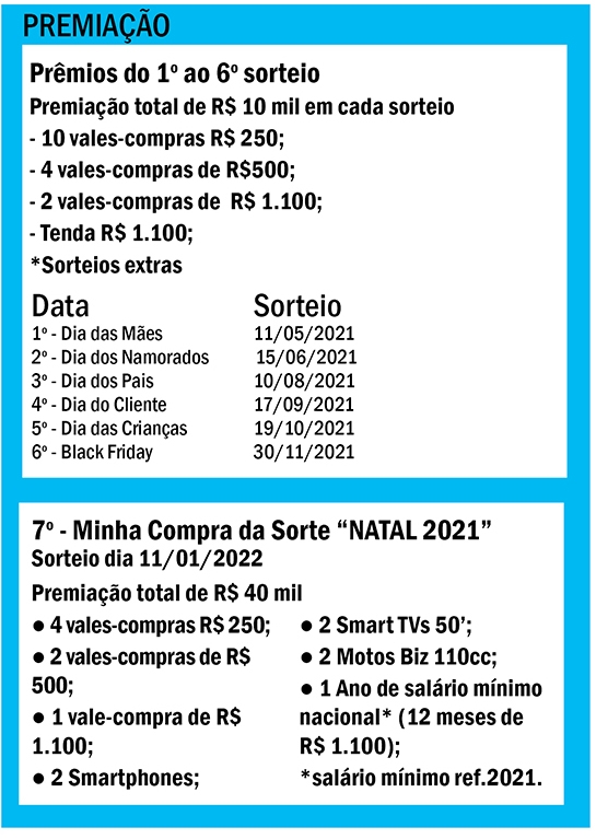 Uma das grandes novidades é a Tenda Três de Maio é Show que será instalada na praça em frente a prefeitura, nos sábados que antecedem os sete sorteios da promoção, das 9h às 17h. Quem apresentar as Notas Fiscais das compras da semana pode trocar por cupons e que dá direito ao sorteio de R$ 1.100 em vale-compra (1 cupom a cada R$100)