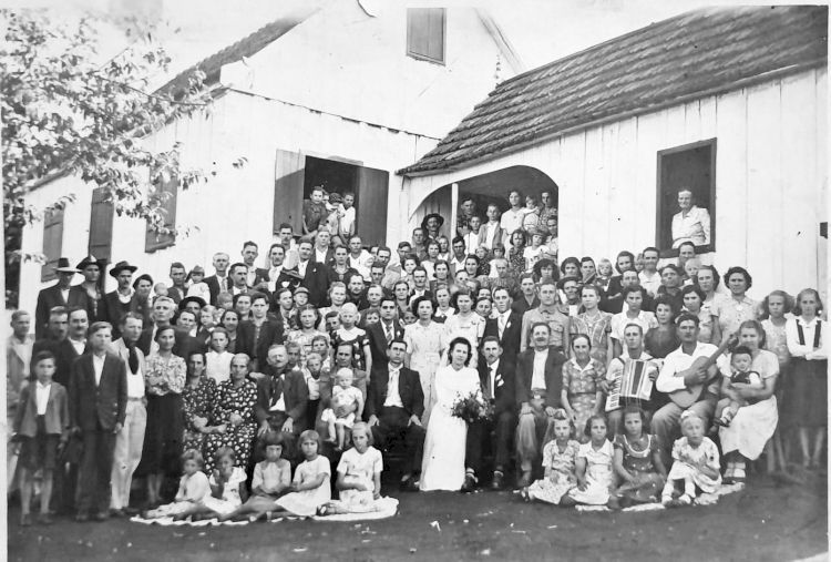 Casamento de Estanislau Zareski e Maria Onorina Gresele na década de 1950. Reunidos para a foto, diversos moradores de Quaraim a época, como Miguel Helenco e sua esposa, Alma, e Demétrio Danilows e sua esposa Eudóquia