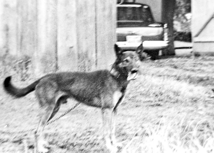 Duque preso a sua corrente nos fundos da igreja da IECLB na década de 1960. Na imagem é possível ver o automóvel do Dr. Gaiger estacionado nos fundos da loja do Sr. Lasch, a qual só conseguiam acessar passando pelo terreno da igreja.